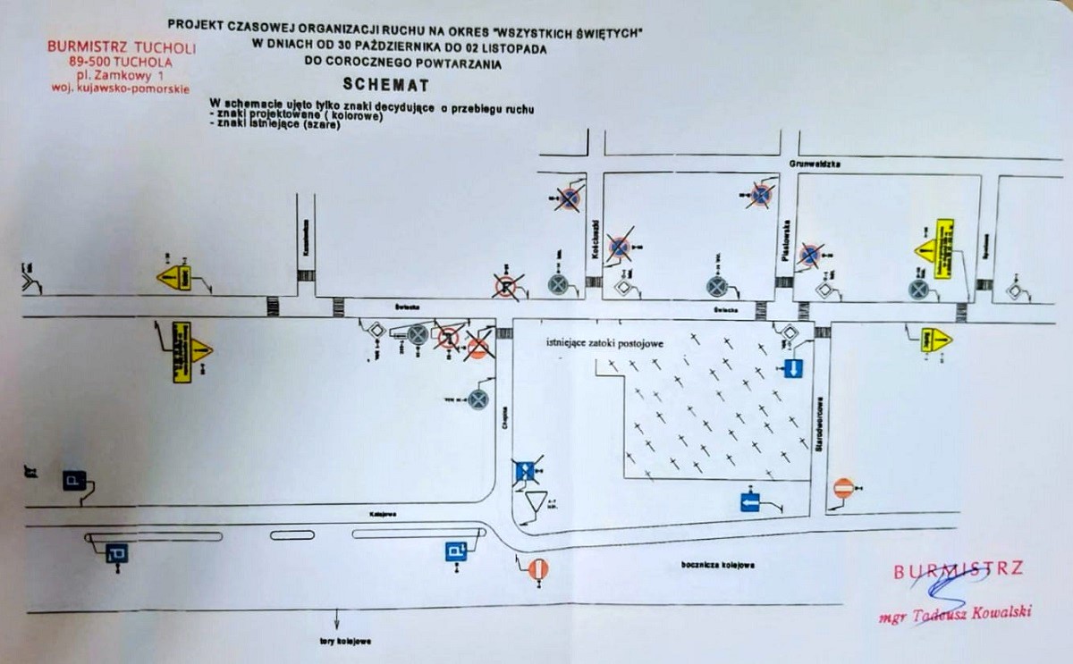 W związku z nadchodzącym Dniem Wszystkich Świętych w rejonie cmentarza parafialnego w Tucholi przy ul. Świeckiej nastąpi czasowa zmiana organizacji ruchu. Zmiany mają na celu usprawnienie ruchu podczas dojazdu do nekropolii.